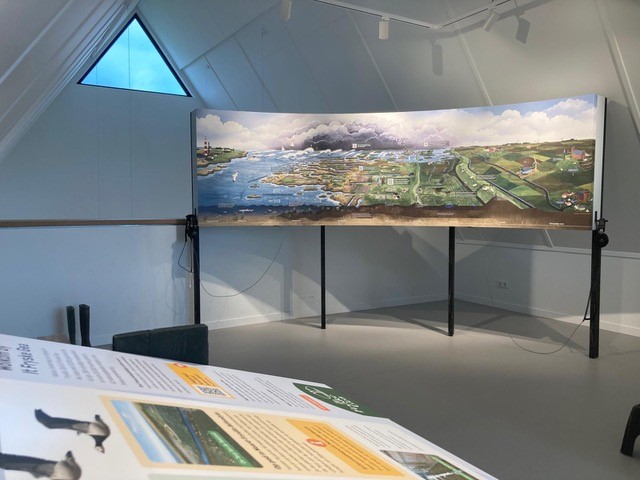 Een grote tekening van het kwelderlandschap in Noard-Fryslân vertelt dit belangrijke verhaal. ‘De expositie brengt prachtig in beeld hoe de kwelder in elkaar zit en hoe de natuur werkt. ’Je ziet hoe de twee verborgen kwelderkrachten zich uiten: het opslaan van CO2 en de werking als golfbreker. ‘Het laat ook zien welke natuurlijke elementen en processen daarbij een rol spelen’, aldus de Vries. In het panorama zijn een aantal QR-codes verwerkt, die je met je smartphone kunt scannen voor extra informatie, zoals de uitleg van Jantsje van Loon-Steensma. Zij is vlakbij de Friese kwelders opgegroeid en onder andere universitair onderzoeker op het gebied van waterveiligheid en natuurlijke oplossingen.